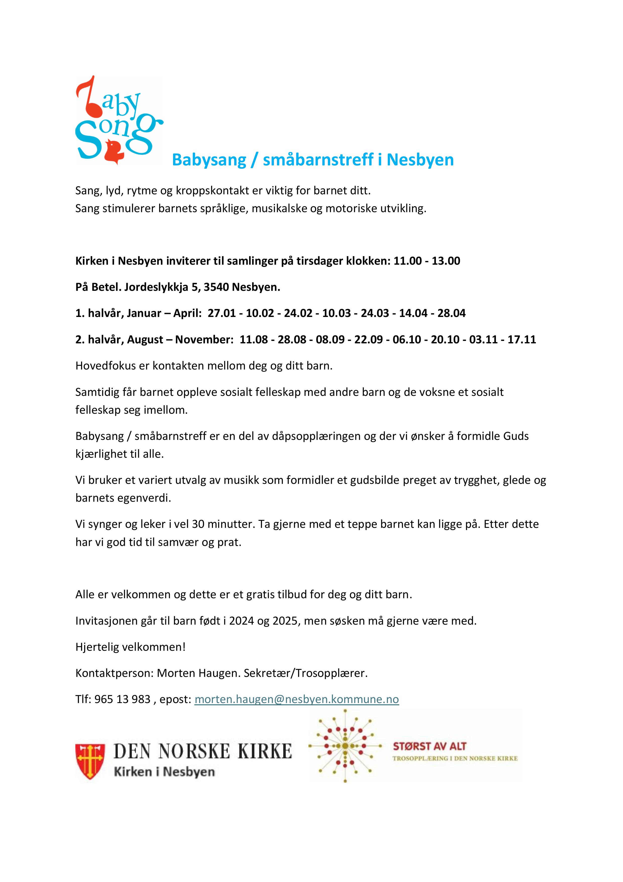 Kirken på Nesbyen ønsker hjertelig velkommen til Babysong